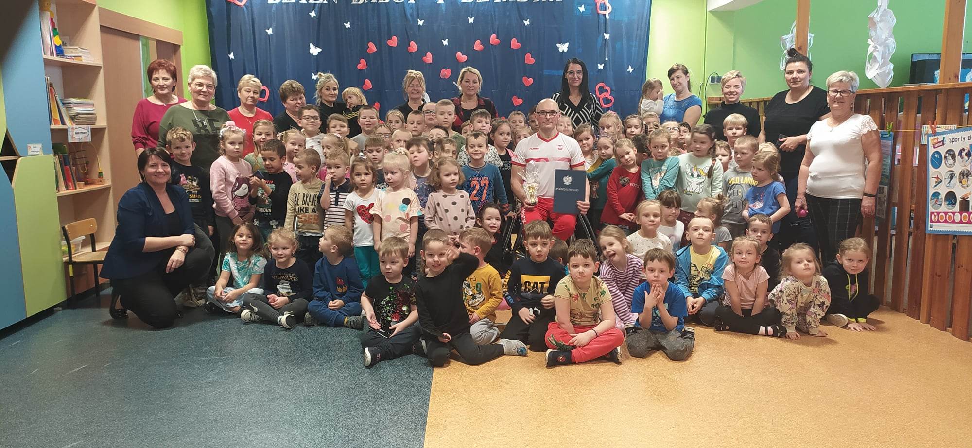 Dnia 27 stycznia 2023r. odbyło się spotkanie przedszkolaków z paraolimpijczykiem Kamilem Fabisiakiem, prywatnie tatą Patrycji z grupy „Biedronek”. W spotkaniu wzięły udział wszystkie dzieci przedszkolne. Pan Kamil cierpi na Dysplazję Włóknistą lewego stawu biodrowego, przez co jego lewa kończyna dolna jest krótsza o 8 cm . Zainteresowanie tenisem ziemnym pojawiło się już w szkole średniej po spotkaniu z panią Judytą Olszewską - reprezentantką Stowarzyszenia Integracyjnego Klub Tenisa Płock. Jego najważniejszymi osiągnięciami są: 4 miejsce na Drużynowych Mistrzostwach Świata we Włoszech 2017r., 5 Miejsce na UNIQLO Wheelchair Doubles Masters 2017r , Wielokrotny Złoty medal w grze singlowej Mistrzostw Polski w tenisie na wózkach. Brał również udział w Igrzyskach Paraolimpijskich w Londynie (2012), w Rio de Janeiro (2016) oraz wTokio (2020). [ źródło: https://paralympic.org.pl/sportowcy/kamil-fabisiak/ ]
