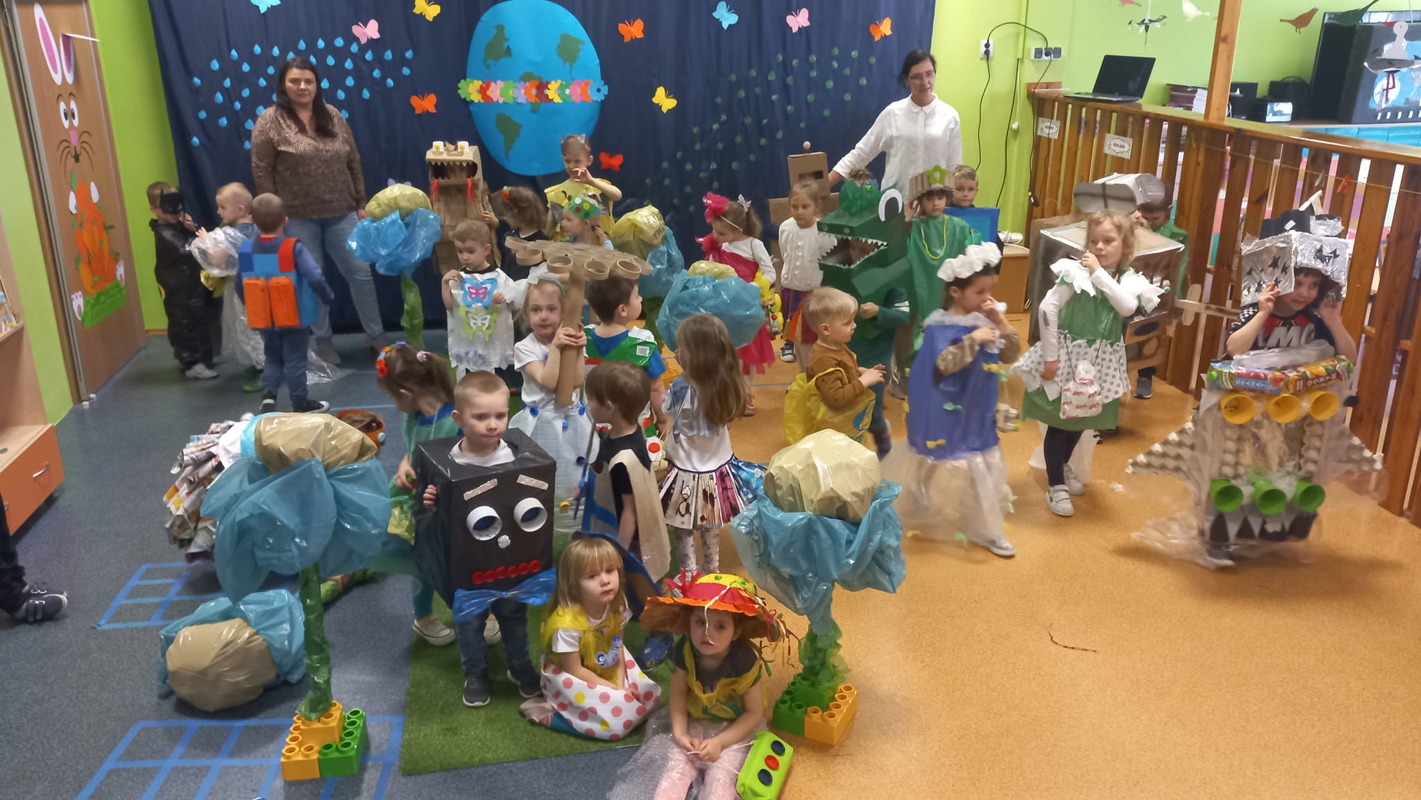Dziś w naszym przedszkolu odbył się niezwykły pokaz mody ekologicznej. Dzieci ze wszystkich grup zaprezentowały bardzo pomysłowe stroje wykonane wraz z rodzicami z różnorodnych materiałów przeznaczonych do recyklingu: tj. kartony, worki, folia spożywcza, gazety, butelki plastikowe, kartonowe itp. Przedszkolaki doskonale sprawdziły się w rolach modeli i modelek, a także udowodniły, że moda i ekologia mogą iść w parze. Wszyscy zostali nagrodzeni gromkimi brawami za zaprojektowanie, wykonanie i zaprezentowanie przepięknych, oryginalnych ekologicznych strojów.