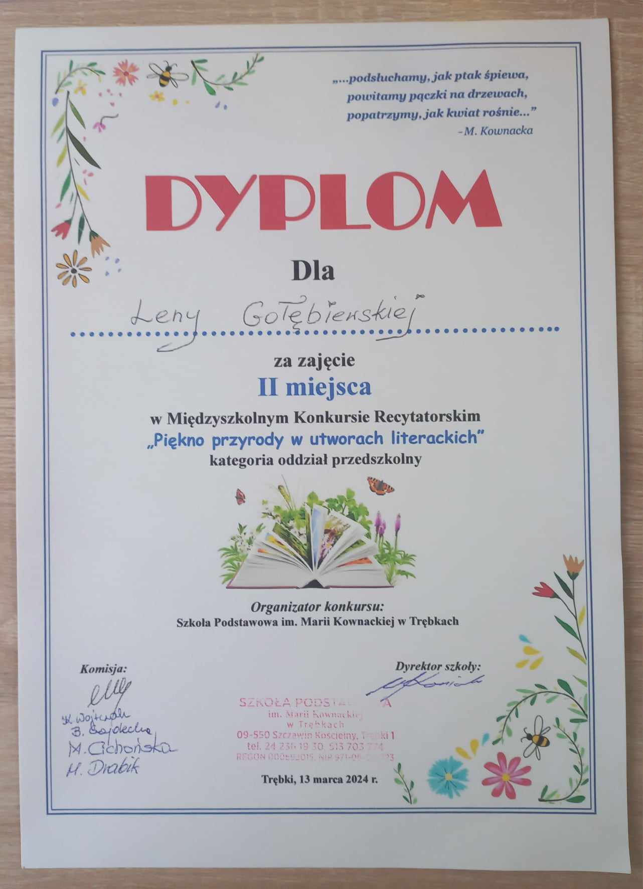 W środę 13 marca 2024r. odbył się międzyszkolny konkurs recytatorki pt."Piękno przyrody w utworach literackich" zorganizowany przez Szkołę Podstawową im.Marii Kownackiej w Trębkach. Zadaniem uczestników było przygotowanie dowolnego utworu polskiego autora o tematyce piękna otaczającej nas przyrody.